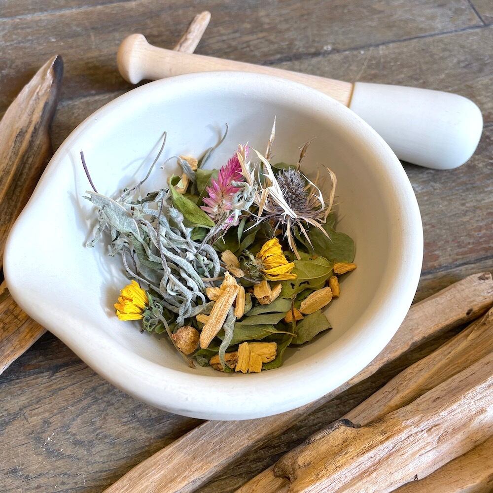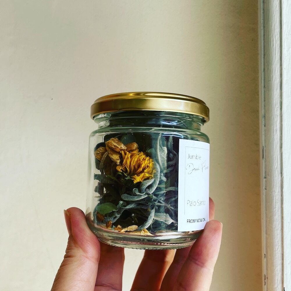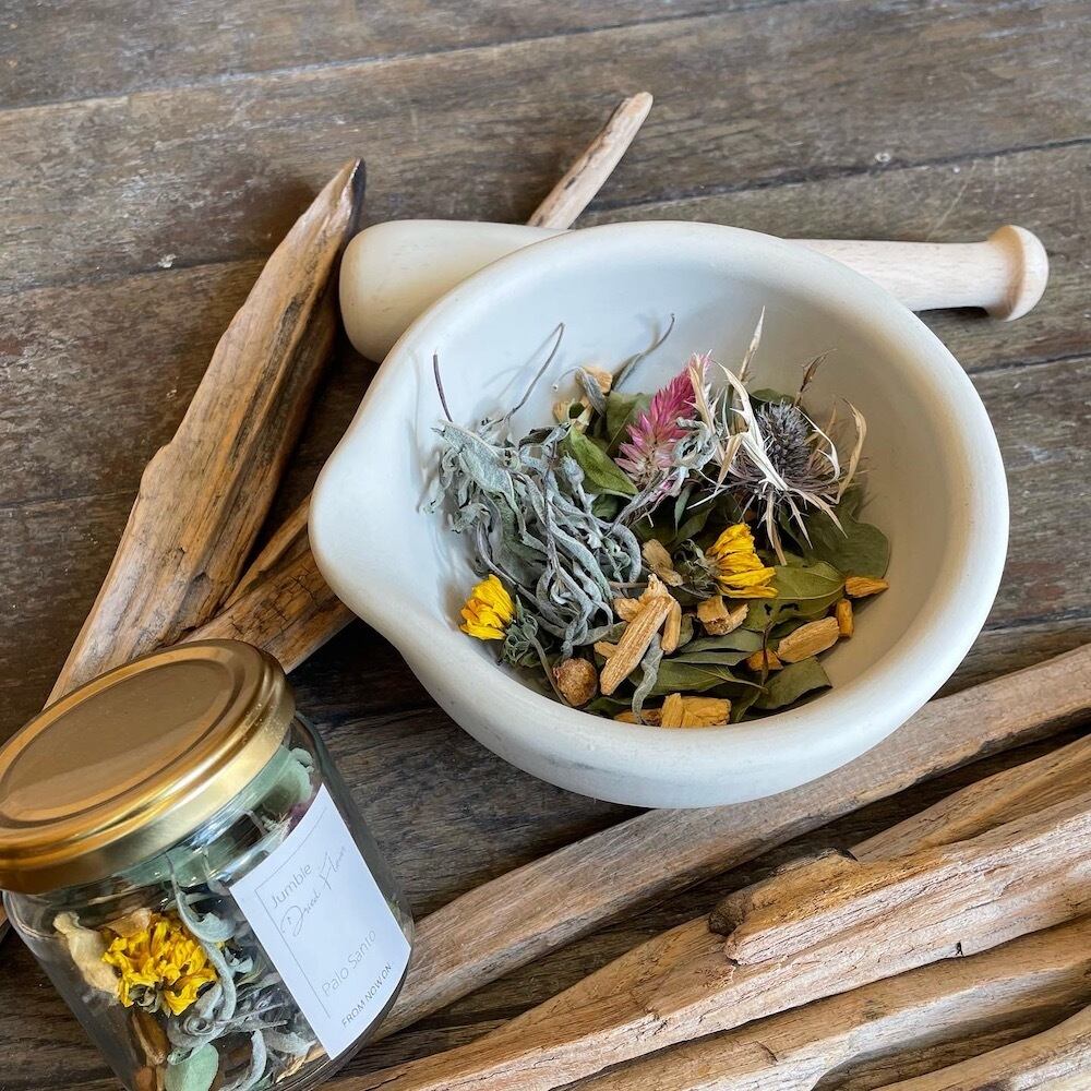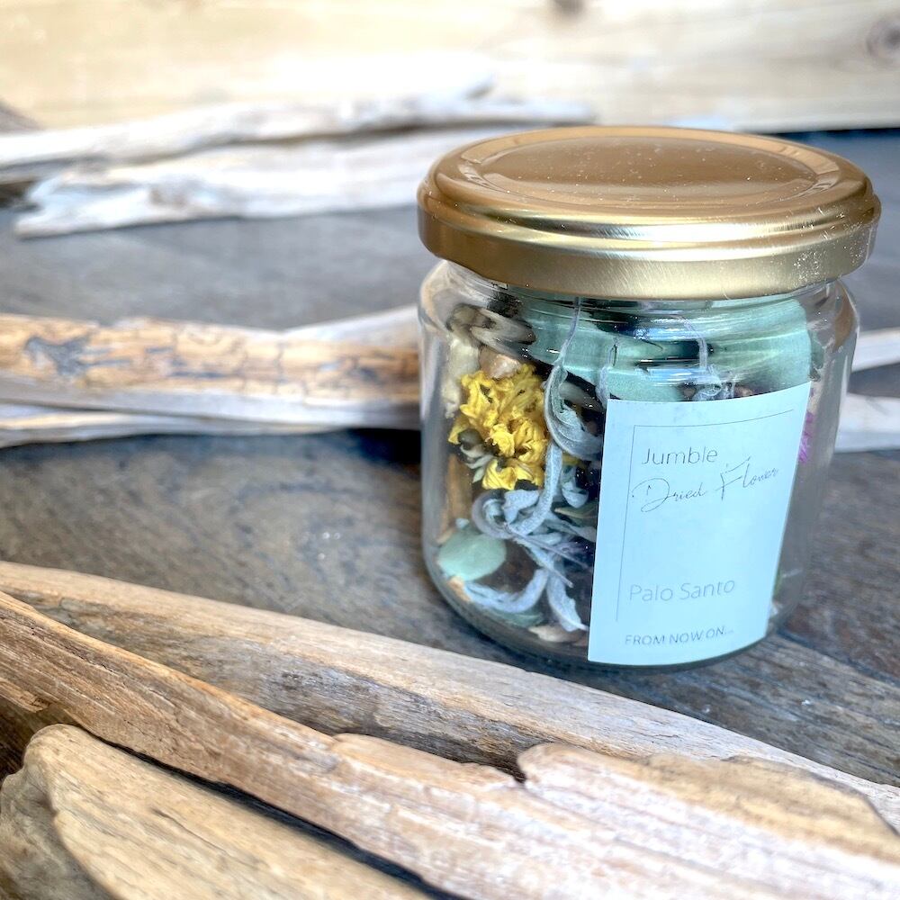 パロサントチップにユーカリやアメジストセージリーフなどのハーブや季節の草花を合わせ、パロサント精油の魔法で熟成させました。