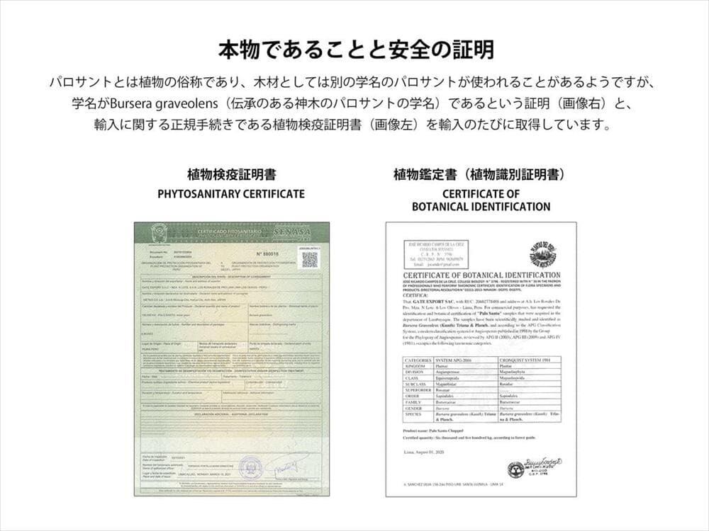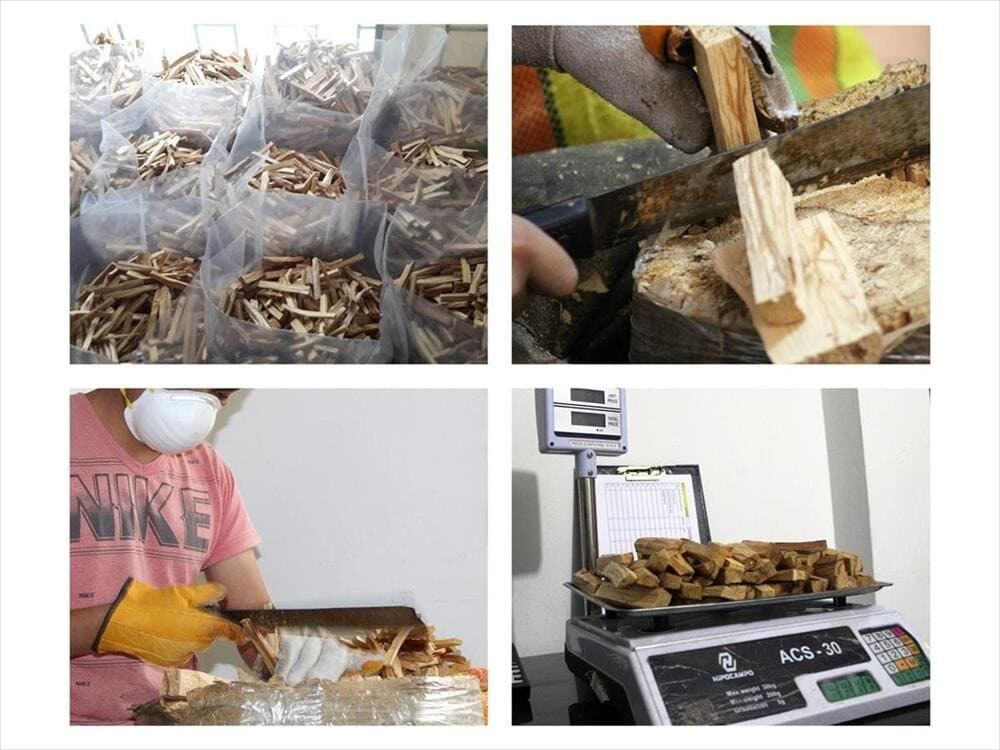 こちらはペルー産パロサントで、苗木から育て植林し、自然を守りつつ10年以上経って自然に枯れたパロサントの樹を伐採して使用しております。