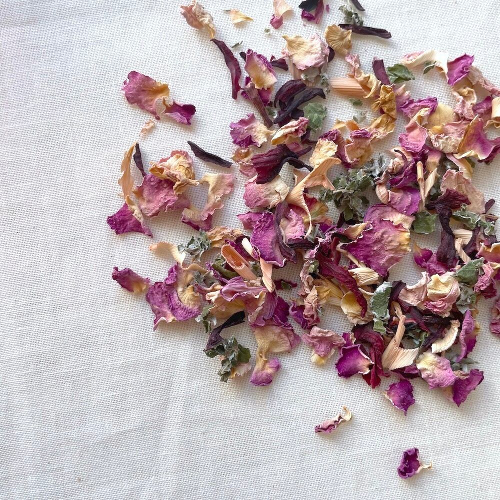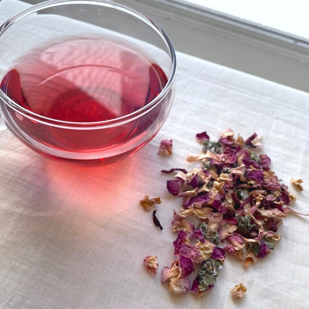 さらに、女性の為のハーブとされるラズベリーリーフやビタミンCたっぷりのハイビスカスをブレンドしました。まさに女性のための美しいピンク色のお茶です。